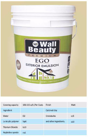 Ego Exterior Emulsion is a high Performance Exterior Wall Finish. It comes with a Unique colour stay technology which ensures long lasting colours. Its high Dirt Pick-up resistance and advanced Anti-Algal formula ensures that the wall remain clean and fresh looking for a long time.