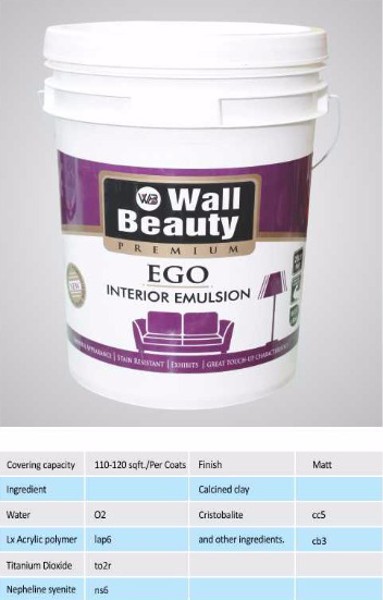 Ego Interior Emulsion is a high Performance Interior Wall Finish. It comes with a Unique colour stay technology which ensures long lasting colours. Its high Dirt Pick-up resistance and advanced Anti-Algal formula ensures that the wall remain clean and fresh looking for a long time.